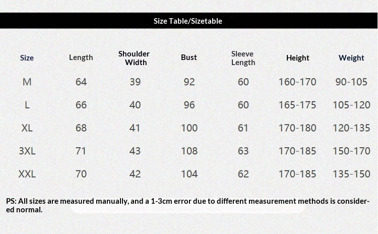 Sizes: M, L, XL, 2XL, 3XL