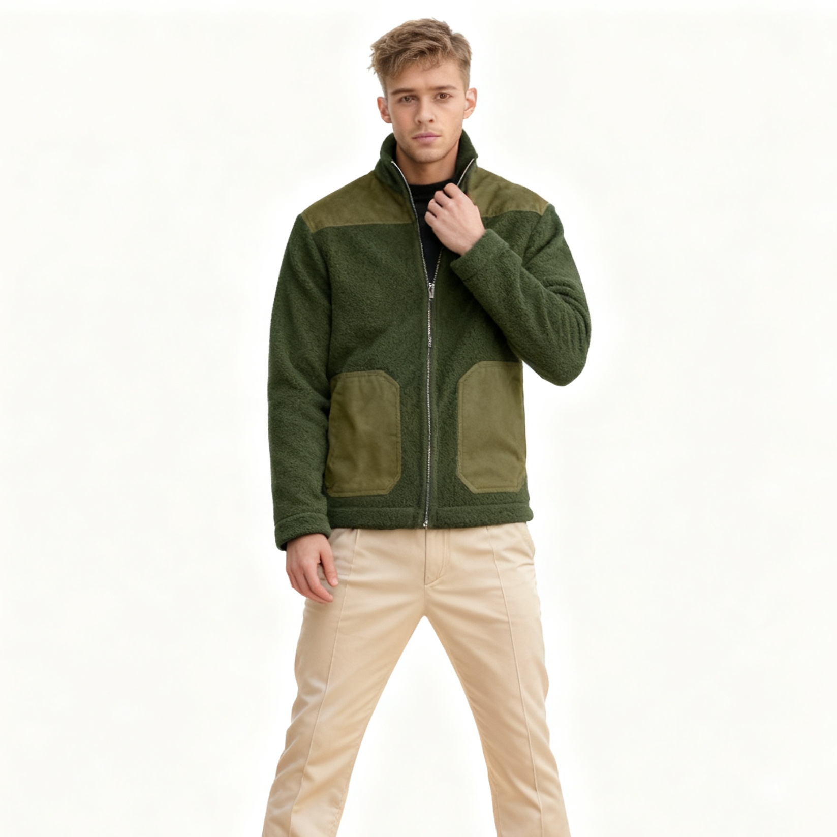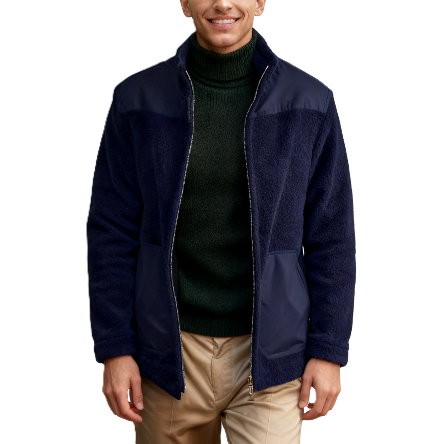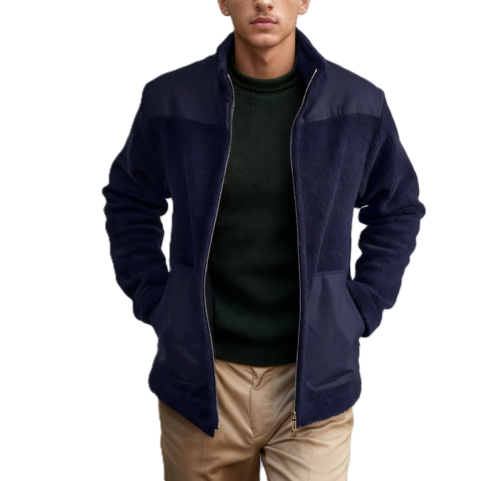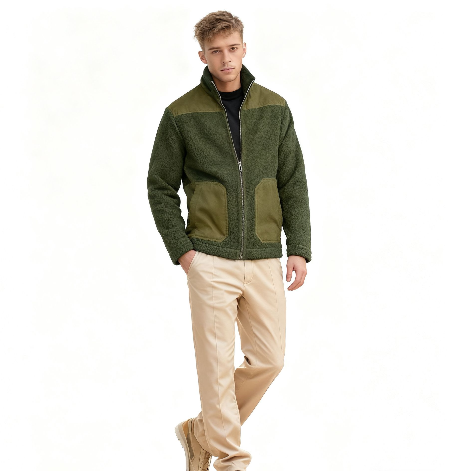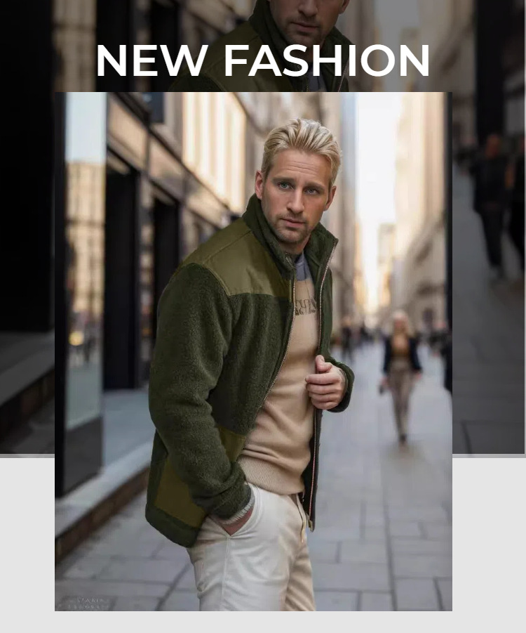 Men's Fleece Patchwork Color-Block Stand-Up Collar Fashion Jacket