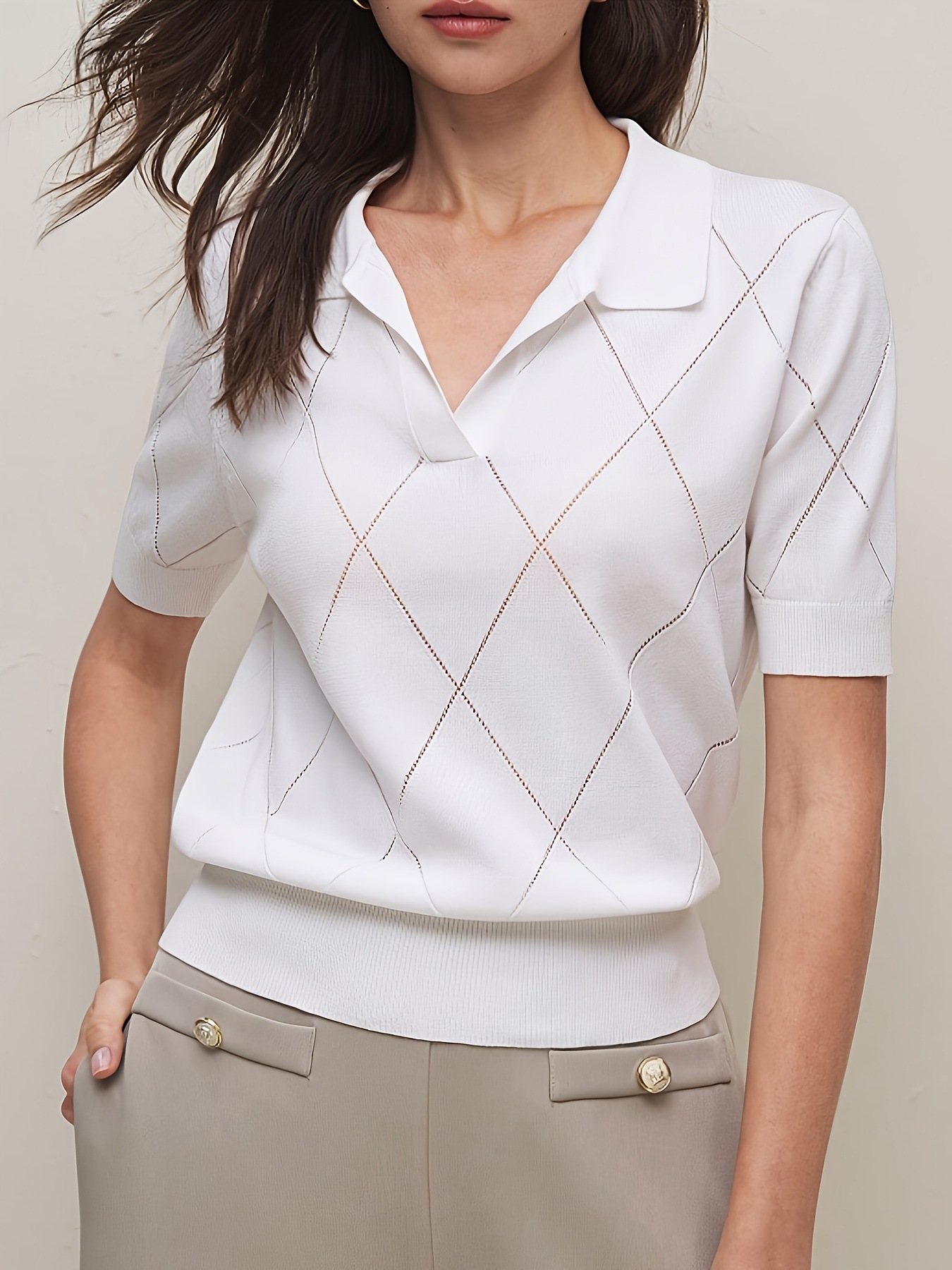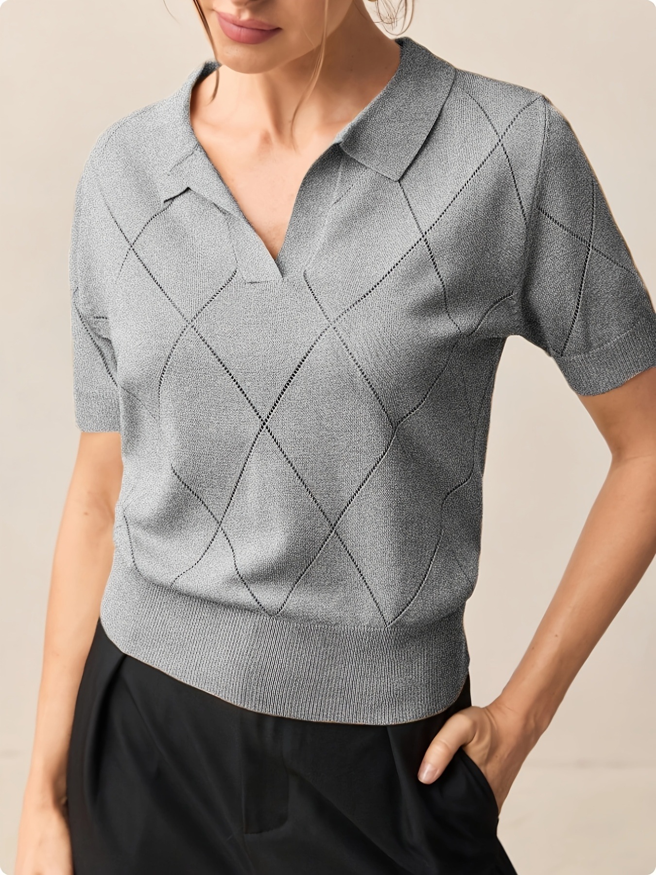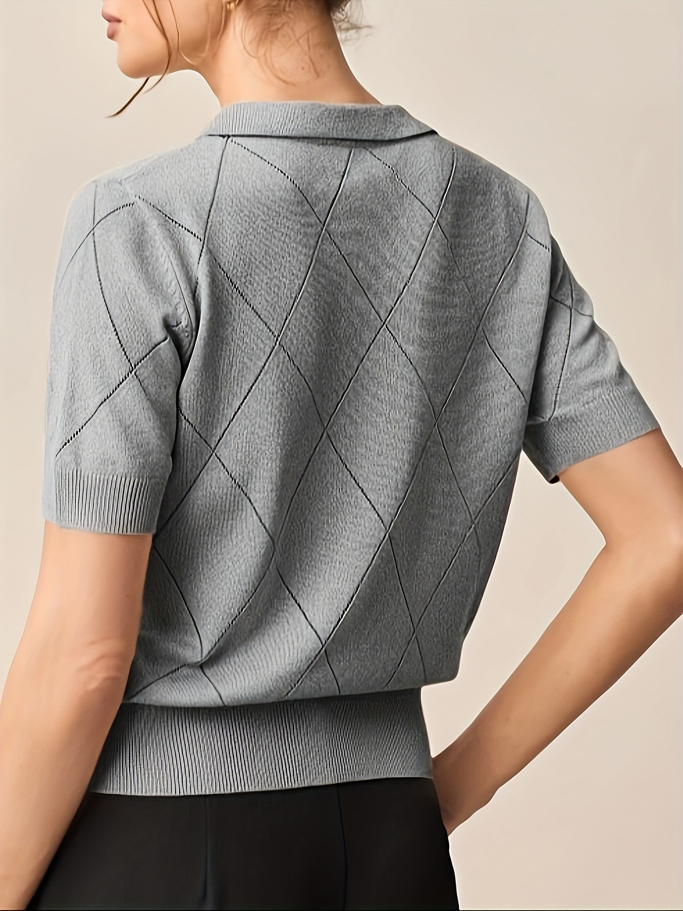 Maglione da donna a maniche corte con collo alto e lavorazione a rombi