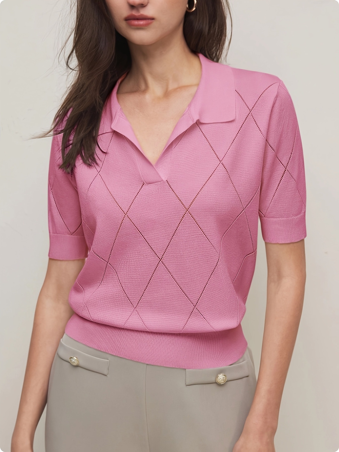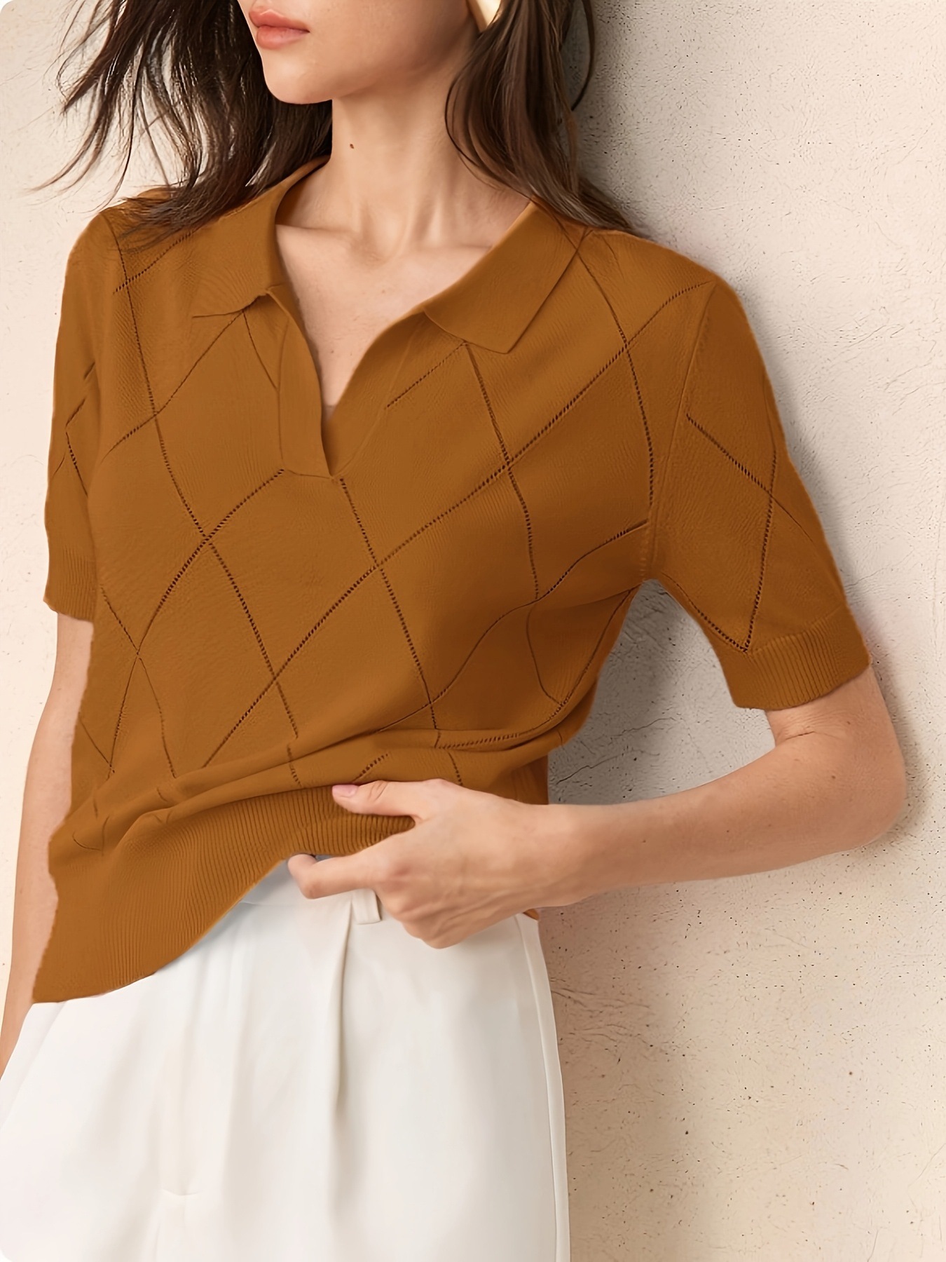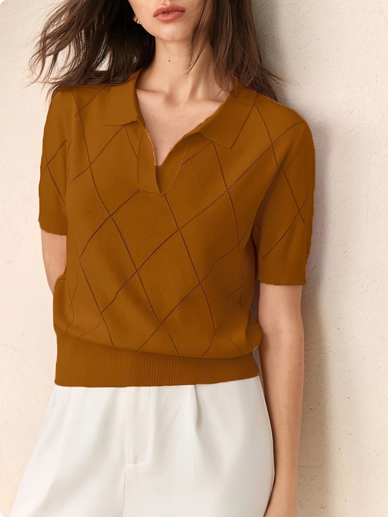 Maglione da donna a maniche corte con collo alto e lavorazione a rombi