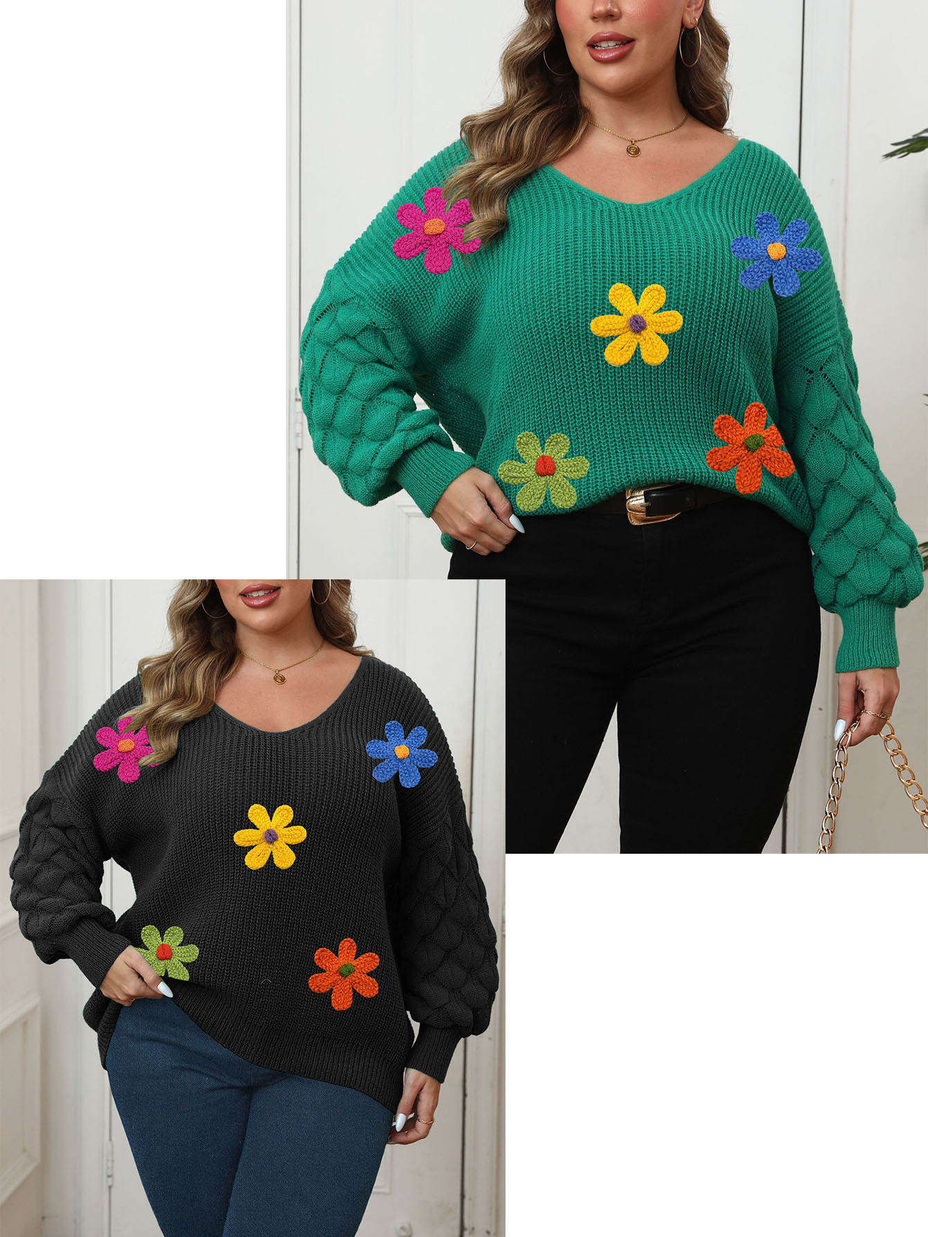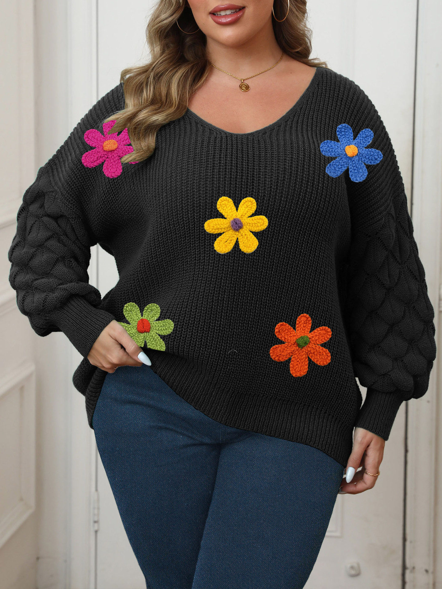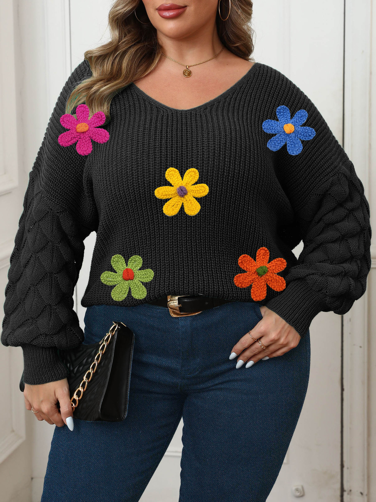 Plus-size Women's Sweater Pineapple Sleeve Patch Base Shirt 3D Wool Embroidery Flowers