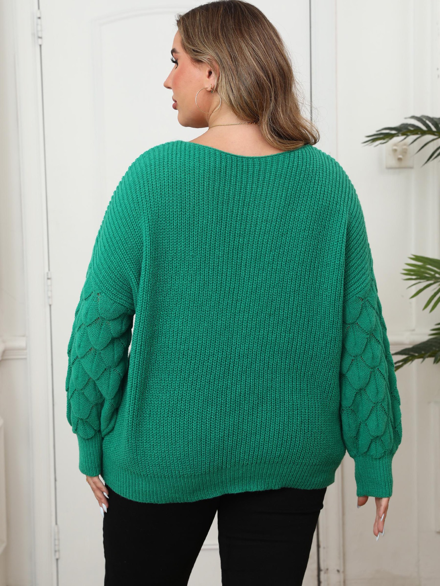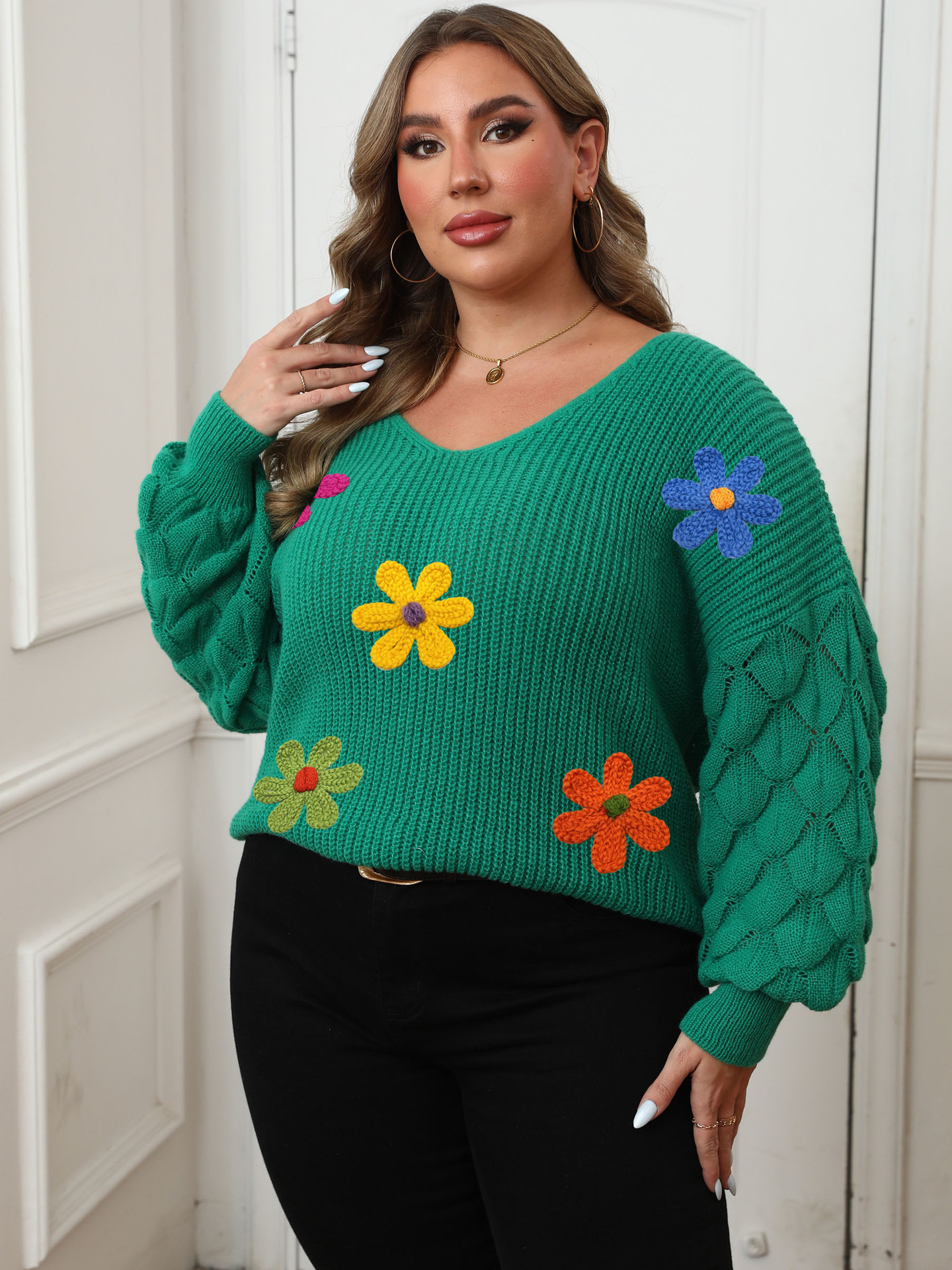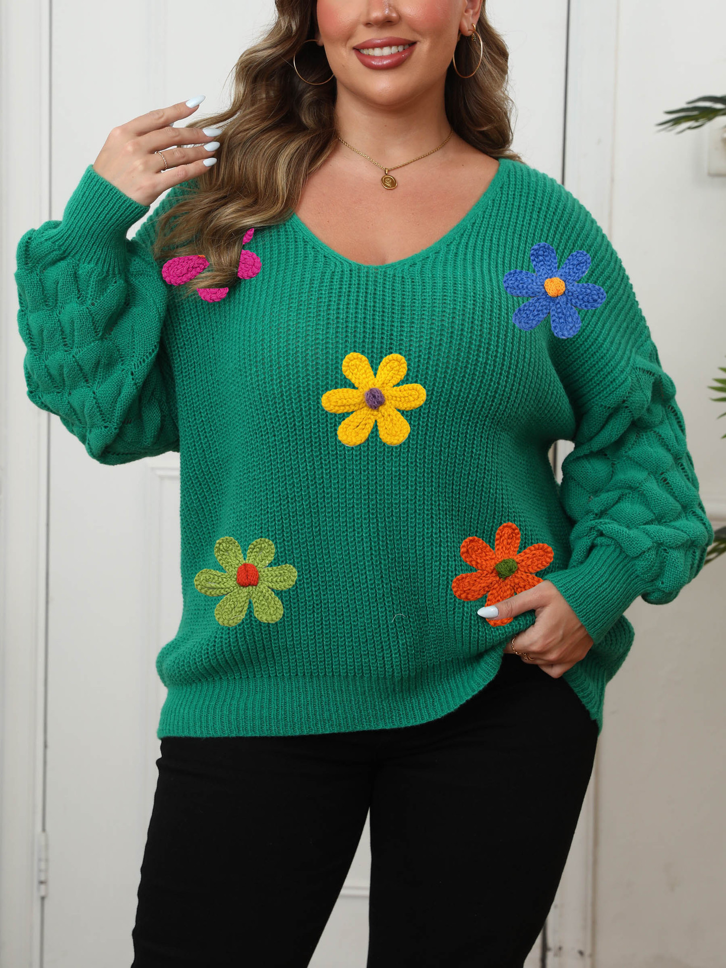 Plus-size Women's Sweater Pineapple Sleeve Patch Base Shirt 3D Wool Embroidery Flowers